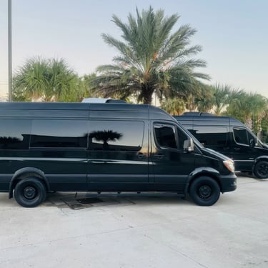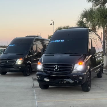 We operate two identical 12–14 passenger Mercedes Sprinter Limo Vans. Each Sprinter delivers the perfect mix of comfort and style, with plush seating, professional chauffeurs, three 40" HD TVs, immersive surround sound, color-changing LED lighting, and a fully stocked wet bar. Whether you're celebrating or relaxing, we’ll tailor the ride to your vibe.